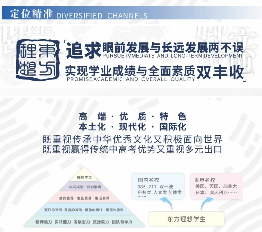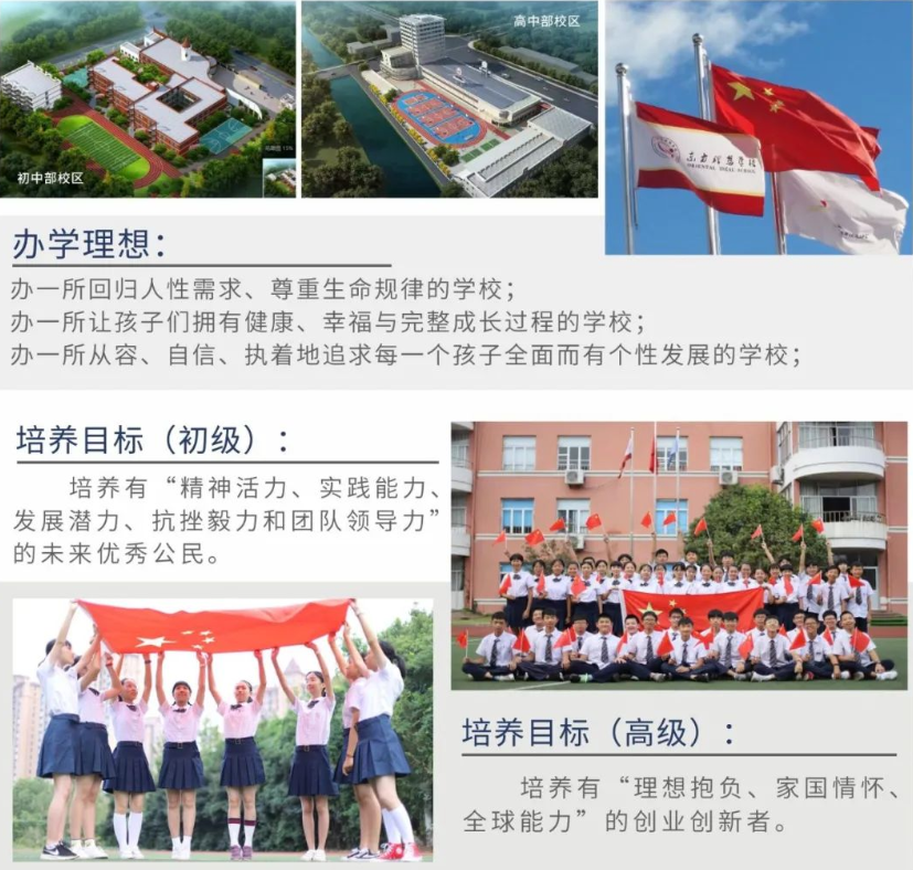 东方理想教育集团创办于2013年,是一所以“探索理想教育·实现教育理想”为办学宗旨,以“推进教育教学改革与创新人才培养方式”为办学使命,以“培养有理想抱负、家国情怀、全球能力的创业创新者”为育人目标的十二年一贯制优质民办学校。