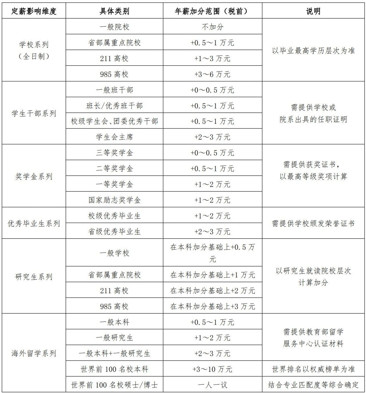 定薪标准:基础薪资10万元+综合素质赋分,具体标准如下(部分加分项可累计加分):